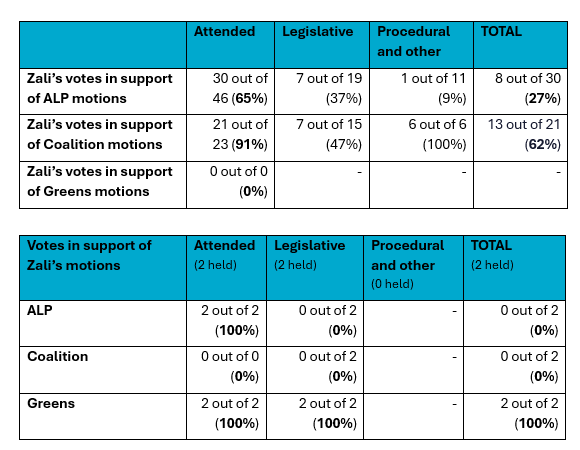 - Voted against the Government and Opposition: 100% of the time that the Govt and Opp voted together (with Govt and Opp 0%)